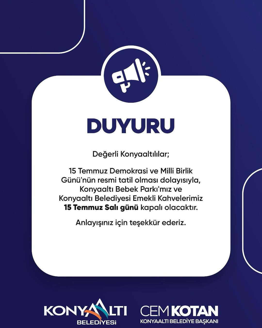 Haberler KONYAALTI 15 Temmuz’da Park ve Kahveler Kapalı Olacak 15 Temmuz’da Park ve Kahveler Kapalı Olacak Haber Merkezi tarafından yayınlandı 13 Temmuz 2025, 13:00 yayınlandı + - Paylaş Bu Yazıyı Paylaş veya linki kopyala Kopyala Değerli Konyaaltılılar; 15 Temmuz Demokrasi ve Milli Birlik Günü nedeniyle, 15 Temmuz Salı günü Konyaaltı Bebek Parkı ve Konyaaltı Belediyesi Emekli Kahveleri kapalı olacaktır. Bu durum için anlayışınıza teşekkür ederiz.Göz AtınMinikler Zeytin İşleme Etkinliğiyle Öğreniyor!Konyaaltı Belediyesi 2026 Bütçesini OnayladıCumhuriyet İçin Tenis Turnuvası Başlıyor! 15 Temmuz’da Park ve Kahveler Kapalı Olacak Yorum Yap Paylaş