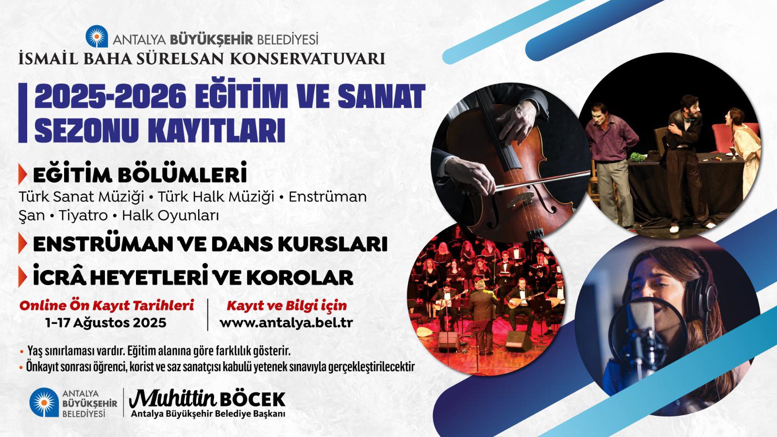 Antalya Büyükşehir Belediyesi İsmail Baha Sürelsan Konservatuvarı, 2025-2026 Eğitim ve Sanat Sezonu için ön kayıtların başladığını duyurdu. Türk Sanat Müziği, Türk Halk Müziği, Tiyatro, Şan, Enstrüman ve Halk Oyunları gibi birçok alanda eğitim almak isteyenler için çeşitli fırsatlar sunuluyor.