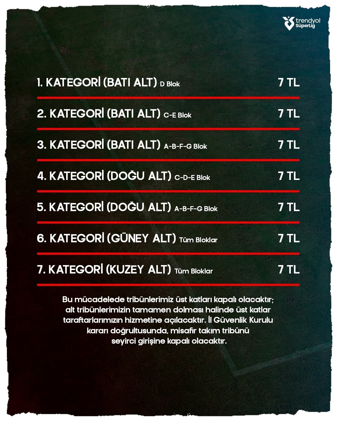 📌 Bu maçta üst tribünler kapalı olacak; alt tribünler tamamen dolduğunda üst kat taraftarlarımızın hizmetine açılacaktır. İl Güvenlik Kurulu’nun almış olduğu karar gereği, misafir takım tribünü seyircilere kapalı kalacaktır.