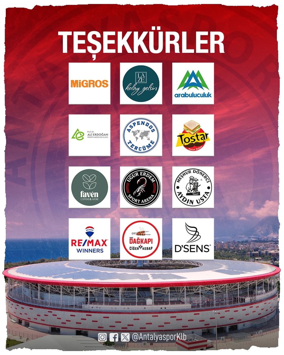 Corendon Airlines Park Antalya Stadyumu’nda yer alan alt kiracılarımız arasında bulunan Migros, Laze Mantı, Antalya Arabuluculuk, Prof. Dr. Ali Erdoğan Sports Medicine Clinic, Aspendos Tercüme, Tostar, Faven Coffee, Uğur Erdem Sport Arena, Meşhur Dönerci Aydın Usta, RE/MAX Winners, Dağkapı Ciğer-Kebap ve D’SENS Güzellik Merkezi’ne kulübümüze sağladıkları destek ve işbirlikleri için teşekkür ediyoruz.