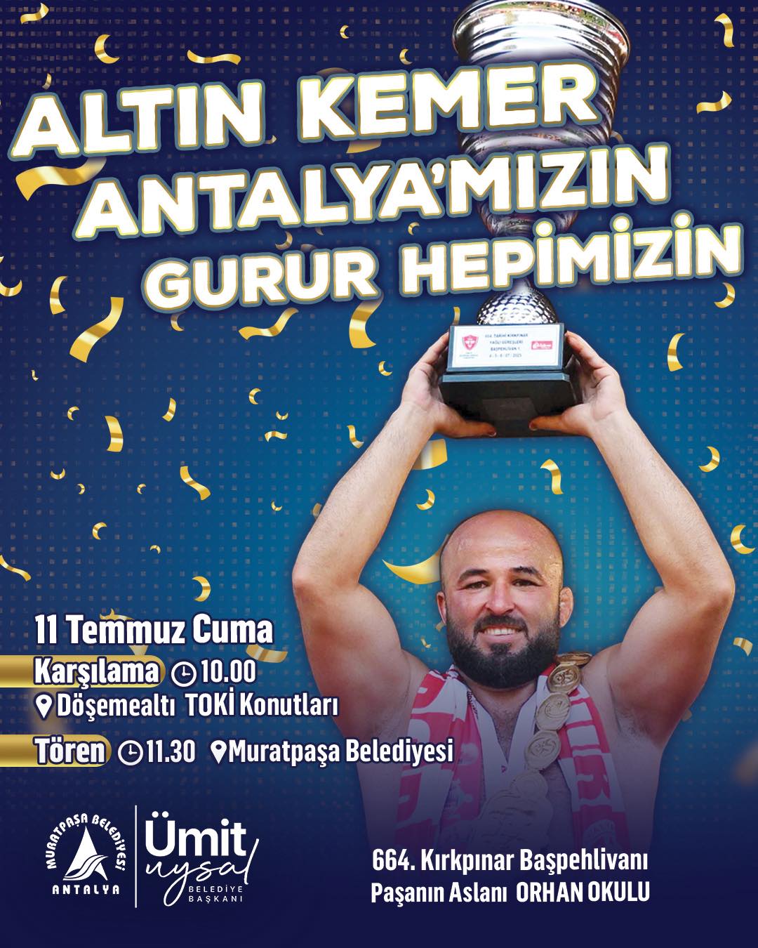664. Kırkpınar Yağlı Güreşleri’nde altın kemeri Antalya’ya kazandıran Başpehlivanımız Orhan Okulu, 11 Temmuz Cuma günü büyük bir coşkuyla karşılanacak!
