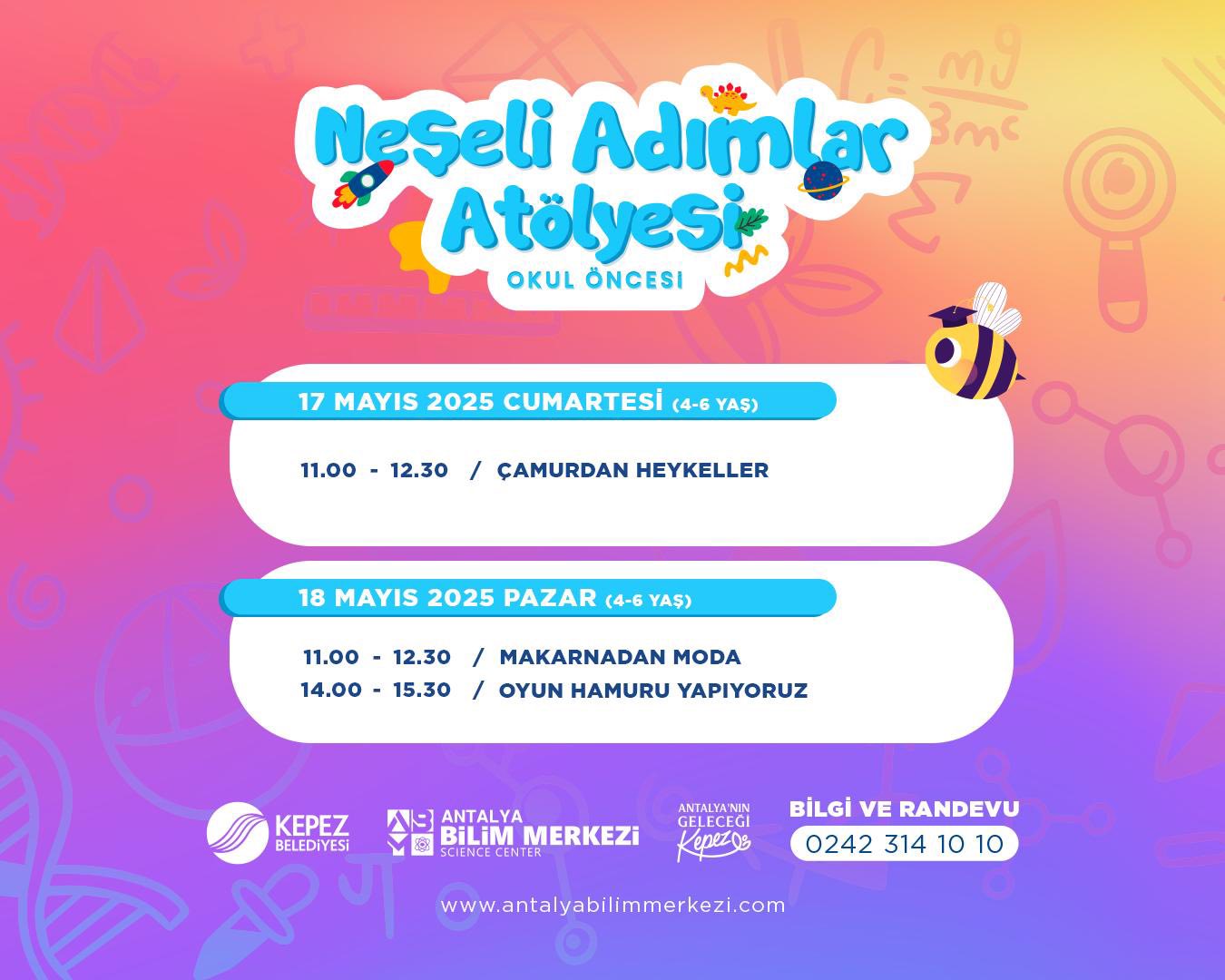 Neşeli Adımlar Atölyesi ve Bilim Atölye çalışmalarıyla dolu bir deneyim için Antalya Bilim Merkezi’ne gelmenizi bekliyoruz. 🧑‍🔬🔭🔬