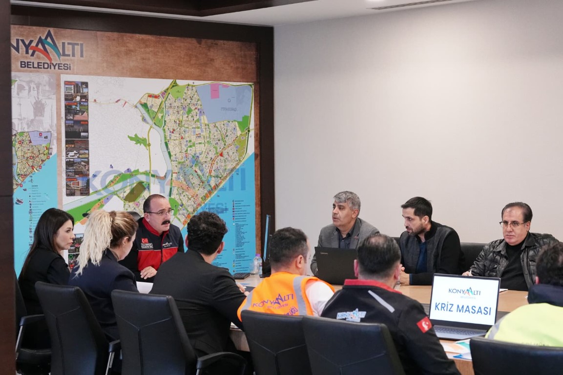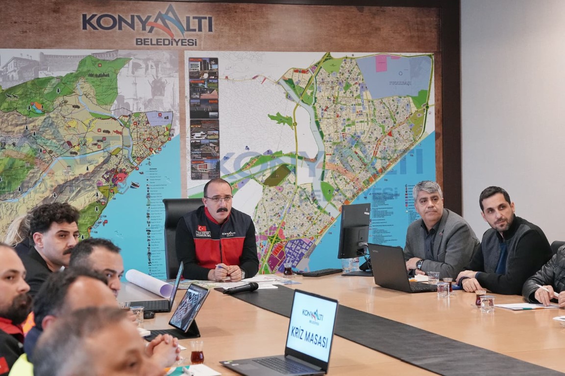 Antalya genelinde yaşanan yoğun yağış ve fırtına nedeniyle Konyaaltı Belediyesi Kriz Masası, Başkan Cem Kotan liderliğinde toplandı. Kotan, “Uzun yıllardır karşılaşmadığımız bir sel felaketi yaşıyoruz. Tüm birimlerimizle birlikte sahadayız, gece gündüz demeden çalışıyoruz” dedi.