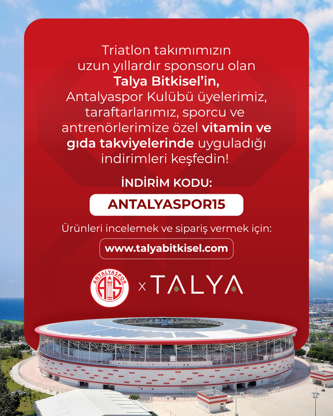 📢 Triatlon takımımızın uzun süredir destekçisi olan Talya Bitkisel, Antalyaspor Kulübü üyeleri, taraftarlar, sporcular ve antrenörler için özel vitamin ve gıda takviyelerinde sunduğu indirim fırsatlarını sizlere sunuyor!