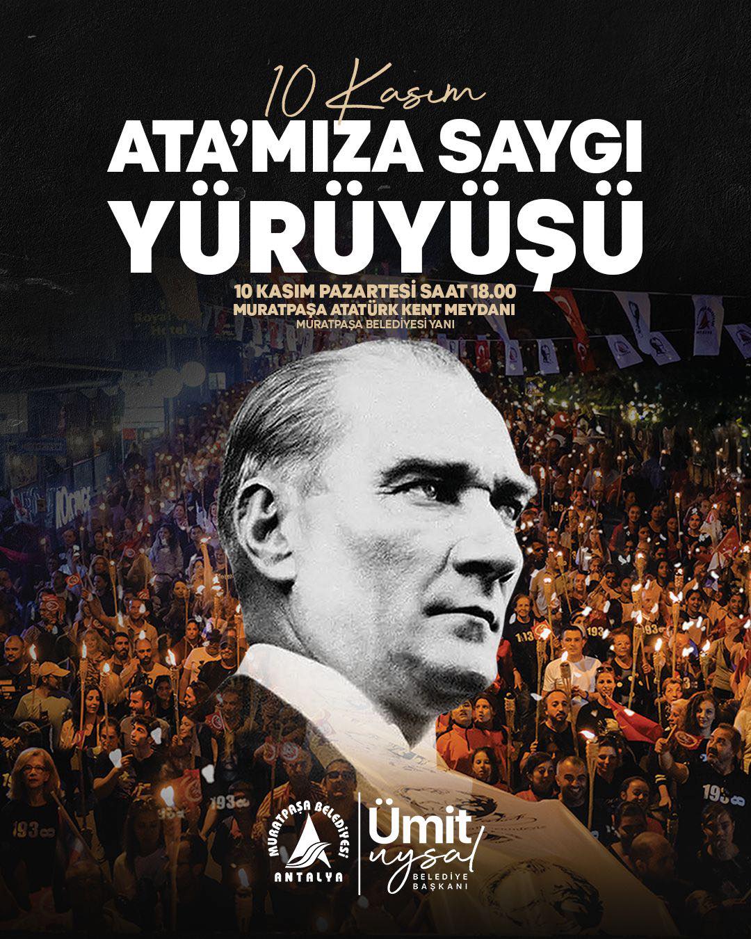Cumhuriyetimizin kurucusu, yolumuzu aydınlatan büyük lider Mustafa Kemal Atatürk’ü; sevgi, saygı, minnet ve özlemle anıyoruz. Muratpaşa Atatürk Kent Meydanı’ndan başlayarak Erdal İnönü Kent Parkı’nda sonlanacak olan Ata’mıza Saygı Yürüyüşü’ne tüm komşularımızı davet ediyoruz.