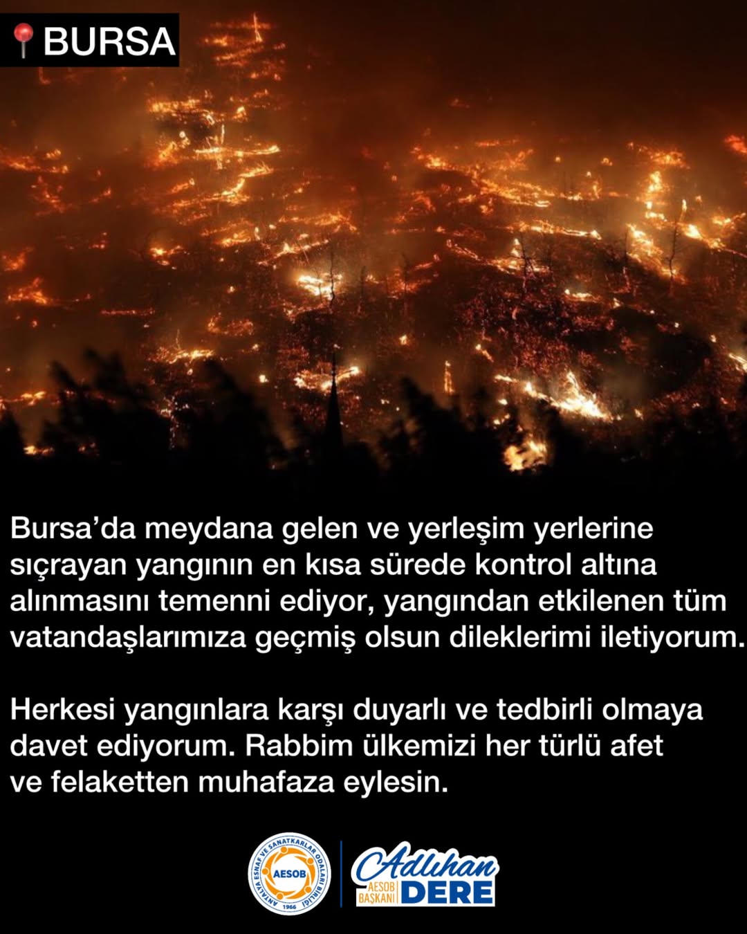 Antalya Esnaf ve Sanatkarlar Odaları Birliği, Bursa’da çıkan ve yerleşim alanlarına sıçrayan yangının bir an önce kontrol altına alınmasını umut ediyor. Yangından etkilenen vatandaşlara geçmiş olsun dileklerini iletiyor.
