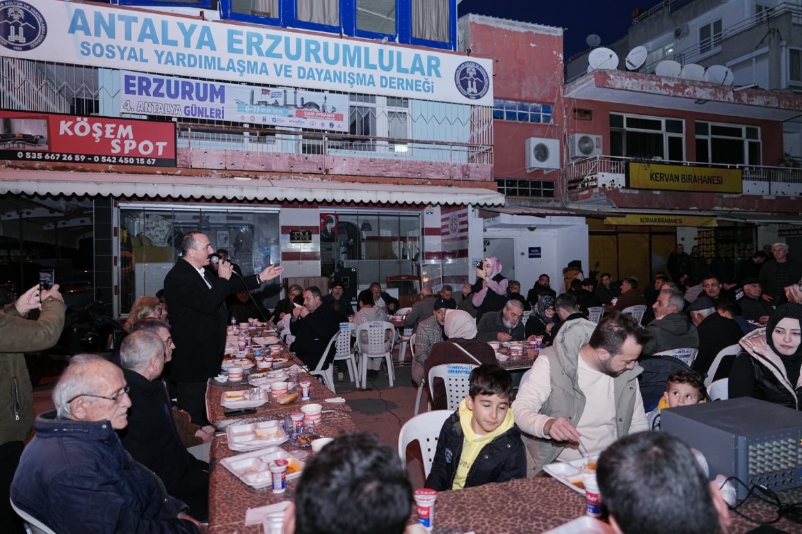 İftar sofrasında dernek üyeleriyle bir arada olmanın mutluluğunu dile getiren Konyaaltı Belediye Başkanı Cem Kotan, “Öncelikle bizleri bir araya getiren Antalya Erzurumlular Derneği Başkanımız Akın Ürek’e ve tüm dernek üyelerine teşekkür ediyorum. Bizleri ilgiyle ve içten sohbetinizle karşıladınız. Ramazan ayı, dayanışma ve kardeşliğimizin güçlü bir şekilde hissedildiği bir dönemdir. Aynı sofrada buluşmak, birliğimizi pekiştiriyor. Erzurum’un kültürü ve misafirperverliğini burada bir kez daha deneyimledik. Konyaaltı Belediyesi olarak, hemşehri derneklerimizle yakın iş birliği içerisinde çalışmaya devam ediyoruz. Birlik ve beraberliğimiz kentimize güç katıyor. İftar sofranıza davetiniz için hepinize teşekkür ediyorum. Ramazan ayınız mübarek olsun” şeklinde konuştu.