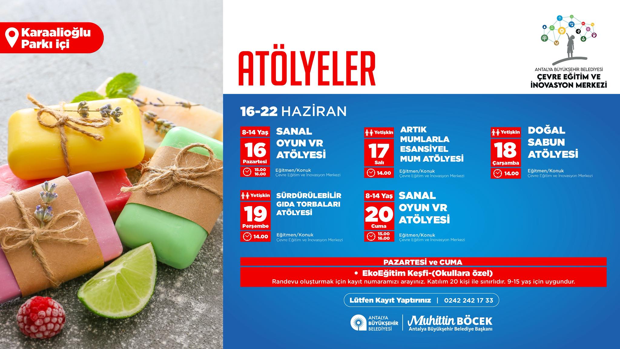 Antalya Büyükşehir Belediyesi Çevre Eğitim ve İnovasyon Merkezi, 16-22 Haziran tarihleri arasında çevre dostu atölye çalışmaları düzenleyerek doğaseverleri bir araya getiriyor. Bu etkinlikler, katılımcılara hem eğlenceli hem de öğretici bir deneyim sunmayı amaçlıyor. ♻️ Ücretsiz atölyelere katılmak için kayıt yaptırmayı unutmayın! 🌍