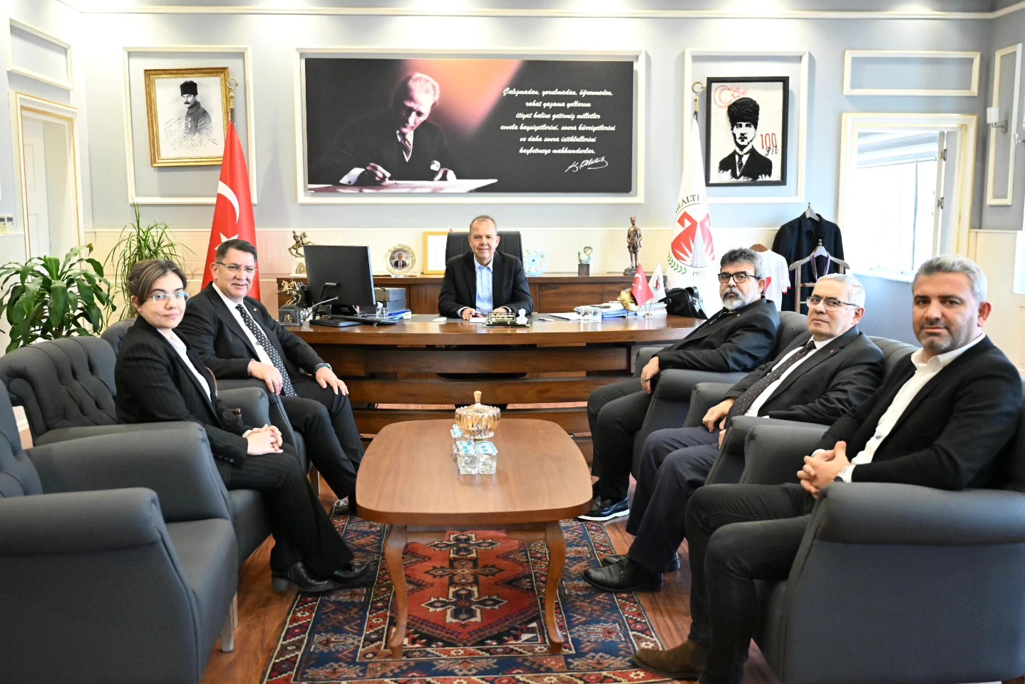 Döşemealtı Belediye Başkanı Sayın Menderes Dal, esnaf ve sanatkarların durumu, sorunları ve talepleri hakkında bir değerlendirme toplantısı gerçekleştirdi. Bu önemli ziyarete, Birlik Başkan Vekilleri ve Antalya Motosiklet, Bisiklet, Oto Lastik Tamircileri ve Oto Yıkamacıları Odası Başkanı Bayram Dal, Antalya Madeni Eşya Sanatkarları Esnaf Odası Başkanı Mehmet Ali Gülaçtı ve Birlik Genel Sekreteri Emine Sadıç da katıldı.