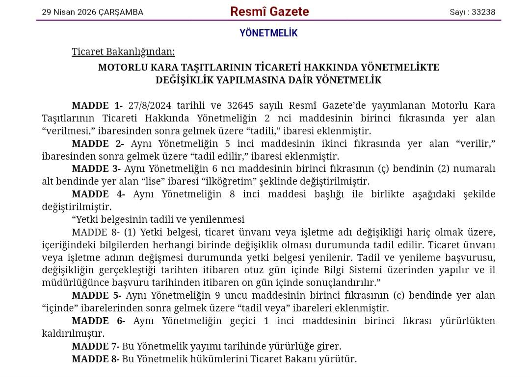 📰 29 Nisan 2026 tarihli 33238 sayılı Resmî Gazete’de, Ticaret Bakanlığı tarafından “Taşınmaz Ticareti Hakkında Yönetmelikte Değişiklik Yapılmasına Dair Yönetmelik” ile “Motorlu Kara Taşıtlarının Ticareti Hakkında Yönetmelikte Değişiklik Yapılmasına Dair Yönetmelik” yayımlandı.