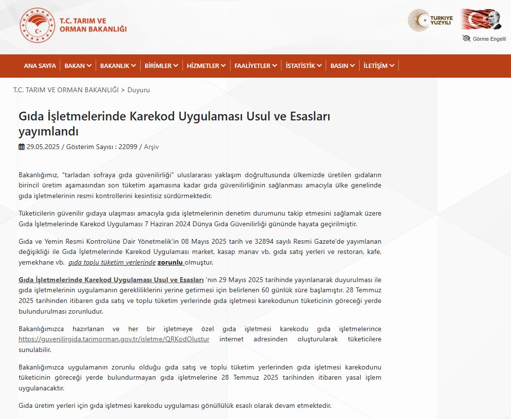 ⏳ 28 Temmuz 2025 tarihinden itibaren, gıda satış ve toplu tüketim alanlarında gıda işletmesi karekodunun, tüketicilerin görebileceği bir yerde bulundurulması zorunlu hale gelecektir.