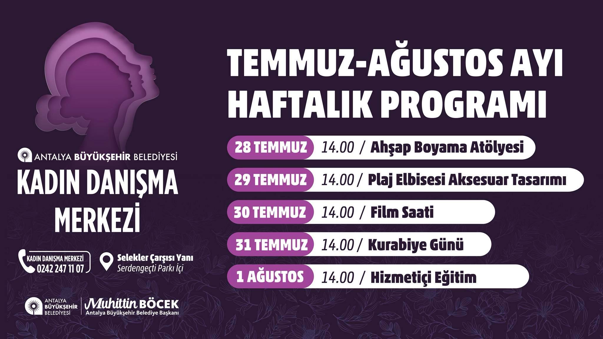 Antalya Büyükşehir Belediyesi Kadın Danışma Merkezi, Temmuz ve Ağustos aylarına özel olarak düzenlediği haftalık etkinlik programını duyurdu. Tüm kadınlarımız bu etkinliklere katılmaya davetlidir! 🌟