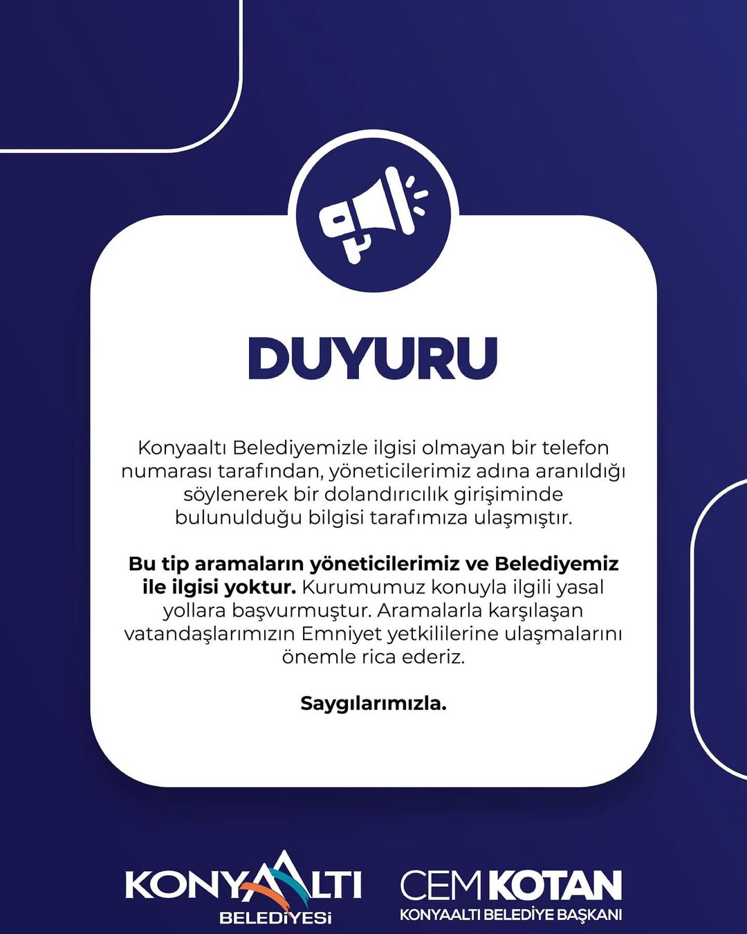 Konyaaltı Belediyemizle herhangi bir bağlantısı olmayan bir telefon numarası üzerinden, yöneticilerimiz adına dolandırıcılık amacıyla arama yapıldığına dair bilgiler bize ulaşmıştır.