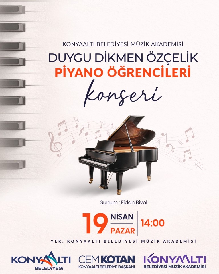 Konyaaltı Belediyesi Müzik Akademisi, sanatseverlerle buluşmak üzere iki konser düzenliyor. Konserler, 17 ve 19 Nisan tarihlerinde Konyaaltı Belediyesi Müzik Akademisi Konser Salonu’nda gerçekleşecek.
