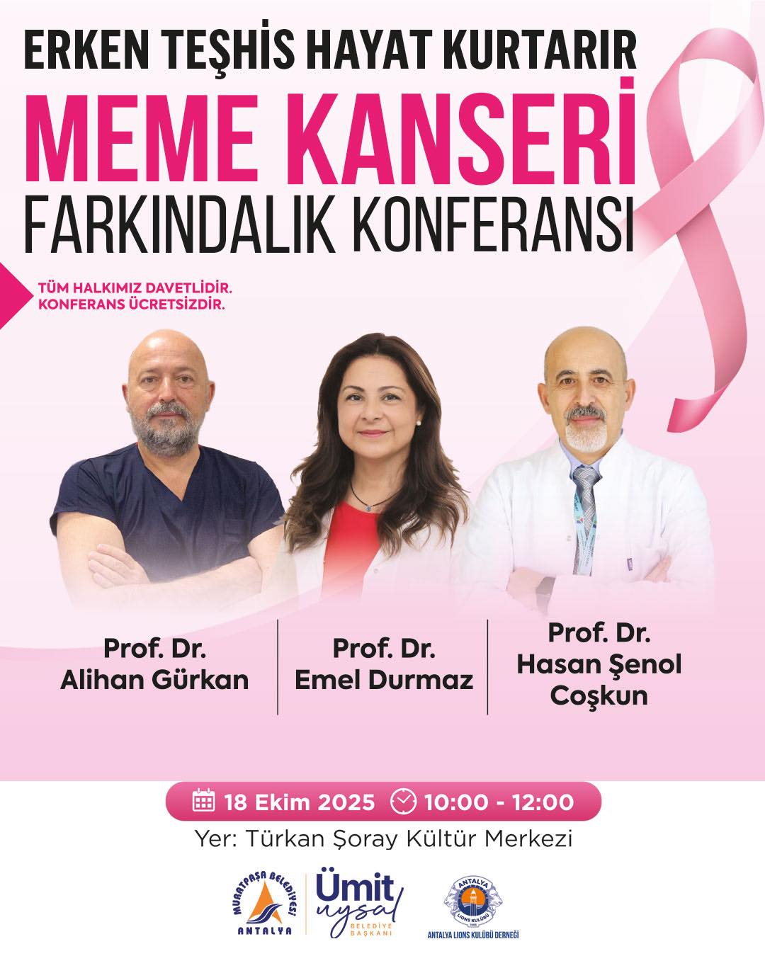 Meme kanseri farkındalığına dikkat çekmek amacıyla düzenlediğimiz konferansa, değerli uzmanlarımız Prof. Dr. Alihan Gürkan, Prof. Dr. Emel Durmaz ve Prof. Dr. Hasan Şenol Çoşkun katılacak. Tüm komşularımız bu önemli etkinliğe davetlidir.
