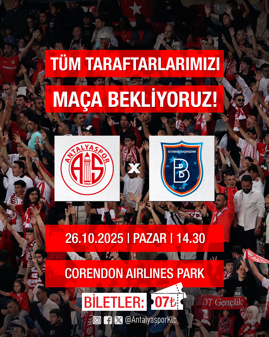 🔴⚪️ Antalyaspor’umuz, Trendyol Süper Lig 2025-2026 sezonunun 10. haftasında, ev sahibi olduğu Corendon Airlines Park Antalya Stadı’nda Başakşehir FK ile bir araya gelecek. Bilet fiyatlarının sadece 0️⃣7️⃣₺ olarak belirlendiği bu önemli müsabakada, tüm taraftarlarımızı tribünleri doldurmaya ve kırmızı beyaz sevdamızı coşkuyla haykırmaya çağırıyoruz!