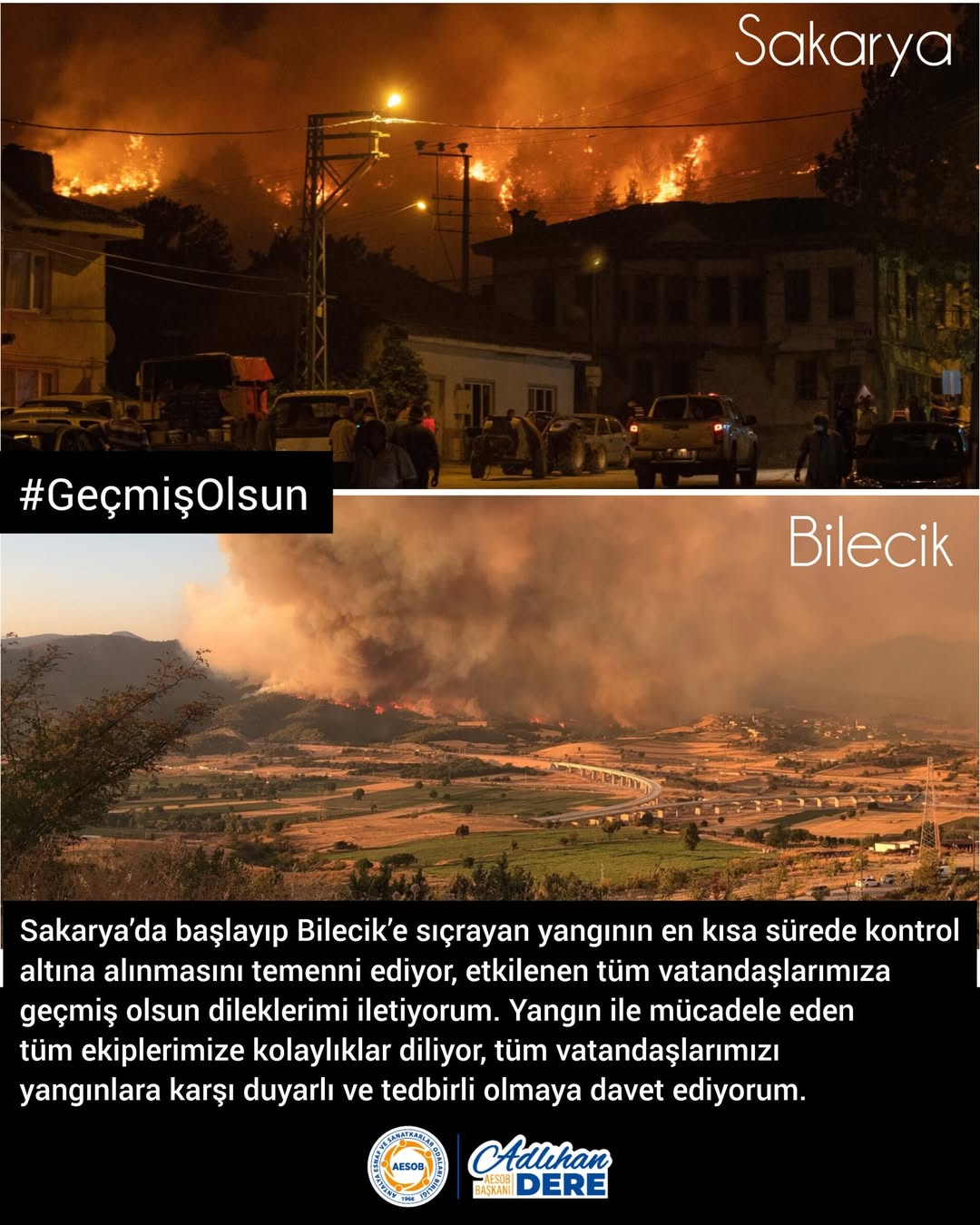 #Sakarya’da başlayan ve #Bilecik’e yayılan yangının en kısa sürede kontrol altına alınması için dileklerimizi iletiyoruz. Bu zor süreçte etkilenen tüm vatandaşlarımıza geçmiş olsun dileklerimizi sunuyoruz.