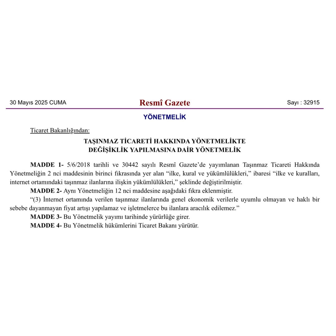 📢 30 Mayıs 2025 tarihinde 32915 sayılı Resmi Gazete’de, Taşınmaz Ticareti Hakkında Yönetmelik’te değişiklik yapılmasına dair yeni bir düzenleme yayımlandı.